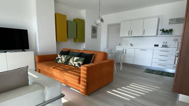 Dispone di 2 camere da letto matrimoniali entrambre con bagno; luminoso soggiorno con cucina attrezzata (Nespesso, microonde e minipimer), smart TV.